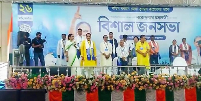 লাউদোহা,২৬ মার্চঃ আসন্ন পশ্চিমবঙ্গ বিধানসভা নির্বাচন উপলক্ষ্যে দক্ষিণবঙ্গে প্রচার শুরু করে দিলেন তৃণমূল সুপ্রিমো মমতা বন্দ্যোপাধ্যায়। যার সূচনা হল বৃহস্পতিবার পশ্চিম বর্ধমান জেলার পান্ডবেশ্বর বিধানসভার লাউদোহা ফুটবল ময়দান থেকে। পূর্ব নির্ধারিত সূচী মেনেই উত্তরবঙ্গ থেকে এদিন দুপুর ১টা নাগাদ স্থানীয় অস্থায়ী হেলিপ্যাডে নামে মুখ্যমন্ত্রীর হেলিকপ্টার। পান্ডবেশ্বর কেন্দ্রের তৃণমূল প্রার্থী নরেন্দ্রনাথ চক্রবর্তীর সমর্থনে এই সভায় উপস্থিত ছিলেন আসানসোল উত্তর বিধানসভার প্রার্থী তথা রাজ্যের বিদায়ী মন্ত্রী মলয় ঘটক,কুলটির অভিজিৎ ঘটক, রানিগঞ্জের কালোবরণ মন্ডল,জামুড়িয়ার হরেরাম সিং সহ পশ্চিম বর্ধমান জেলার তৃণমূল কংগ্রেসের প্রার্থীরা। তাদের সঙ্গেই ছিলেন তৃণমূলের রাজ্য কমিটির সাধারণ সম্পাদক ভি শিবদাসন।  মঞ্চে ভাষন দেওয়ার শুরু থেকেই একাধিক ইস্যু তুলে বিজেপি ও কেন্দ্রীয় সরকারের ভূমিকার তীব্র সমালোচনা করতে থাকেন মমতা। আসন্ন বিধানসভা নির্বাচনকে কার্যত ‘পাণ্ডব বনাম কৌরব’-এর লড়াই হিসেবে ব্যাখ্যা করে বিজেপির বিরুদ্ধে তীব্র রাজনৈতিক আক্রমণ শানালেন রাজ্যের মুখ্যমন্ত্রী মমতা বন্দ্যোপাধ্যায়। স্পষ্ট ভাষায় তিনি বলেন, “এই লড়াই অন্যায়ের বিরুদ্ধে ন্যায়ের— আমরা পাণ্ডব,বিজেপি কৌরব।” মুখ্যমন্ত্রী তাঁর বক্তব্যে ইঙ্গিত দেন, এই নির্বাচন শুধুমাত্র ক্ষমতার লড়াই নয়,বরং গণতন্ত্র,অধিকার ও সামাজিক সম্প্রীতি রক্ষার সংগ্রাম। ভোটার তালিকা সংশোধন নিয়ে প্রশ্ন তুলে তিনি অভিযোগ করেন,“লক্ষ লক্ষ মানুষের নাম বাদ দেওয়া হচ্ছে। তালিকা প্রকাশ করা হচ্ছে না, রাজনৈতিক দল বা সংবাদমাধ্যমকেও দেওয়া হচ্ছে না—এটা গণতন্ত্রের ওপর আঘাত।” ঐক্যের বার্তা দিয়ে মমতা বলেন, “একটা আঙুলে মুষ্টি হয় না—পাঁচটা আঙুল একসঙ্গে হলেই শক্তি।” ধর্মীয় সম্প্রীতির প্রসঙ্গ টেনে রামনবমী উপলক্ষে কোনও উস্কানিতে পা না দেওয়ার আহ্বান জানান তিনি। পাশাপাশি অন্নপূর্ণা পুজোর শুভেচ্ছা জানিয়ে সহাবস্থানের বার্তাও দেন। এদিনের সভায় রাজনৈতিক আক্রমণের পাশাপাশি উন্নয়নের খতিয়ান তুলে ধরে মুখ্যমন্ত্রী দাবি করেন,আসানসোল-দুর্গাপুর পুলিশ কমিশনারেট,আসানসোল সুপার স্পেশালিটি হাসপাতাল ও কাজী নজরুল ইসলাম বিমানবন্দর—সবই তৃণমূল সরকারের আমলে বাস্তবায়িত হয়েছে। তিনি জানান, ‘স্বাস্থ্যসাথী’ প্রকল্পে ৫ লক্ষ টাকার স্বাস্থ্যসুবিধা,‘লক্ষ্মীর ভান্ডার’-এর আর্থিক সহায়তা এবং ছাত্রদের জন্য ক্রেডিট কার্ড প্রকল্প সাধারণ মানুষের পাশে থাকার প্রমাণ। সভায় তিনি জোরের সঙ্গে জানান, “লক্ষ্মীর ভান্ডার আজীবন চলবে,ভবিষ্যতে ‘দুয়ারে স্বাস্থ্য’ পরিষেবাও চালু করা হবে,”। কেন্দ্রের বিরুদ্ধে আ