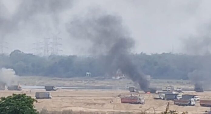 রানীগঞ্জ,৩০ মার্চঃ রানীগঞ্জের তিরাটে একটি দুর্ঘটনাকে কেন্দ্র করে উত্তেজনা ছড়াল বালি ঘাটে। উত্তেজিত জনতা একাধিক বালি বোঝাই ডাম্পারে আগুন লাগিয়ে দেয়। চারিদিক কালো ধোঁয়ায় ঢেকে যায়। খবর পেয়ে ঘটনাস্থলে আসে পুলিশ। স্থানীয় সূত্রে জানা গেছে, সোমবার দুপুরে অবিনাশ মুর্মু নামে এক সাইকেল আরোহী রাস্তা পারাপার করছিলেন। সেই সময় বালি বোঝাই একটি ডাম্পার তাঁকে ধাক্কা মেরে চলে যায়। গুরুতর আহত হন অবিনাশ। তাঁকে আশঙ্কাজনক অবস্থায় একটি হাসপাতালে নিয়ে যাওয়া হয়। ওই দুর্ঘটনার সময় রানিগঞ্জে প্রচার করছিলেন আসানসোল দক্ষিনের বিজেপি বিধায়ক তথা এবারের প্রার্থী অগ্নিমিত্রা পাল। খবর পেয়ে তিনি ঘটনাস্থলে আসেন। বালি কারবারের বিরুদ্ধে প্রতিবাদে সরব হন অগ্নিমিত্রা। তিনি দাবি করেন,এলাকায় অবৈধ বালি কারবার চলছে। এরজন্য তিনি মমতা বন্দ্যোপাধ্যায় সহ তৃণমূল দলকে দায়ী করেন। দুর্ঘটনার শিকার ওই ব্যক্তির পরিবারকে দশ লক্ষ টাকা আর্থিক ক্ষতিপূরণ সহ একটি চাকরি দেওয়ার দাবিও জানান তিনি। এরমধ্যে কে বা কারা বালি ঘাটে গিয়ে বেশ কয়েকটি বালি বোঝাই ডাম্পারে আগুন লাগিয়ে দেয়। ঘটনাটি ঘিরে ব্যাপক চাঞ্চল্য ছড়িয়েছে তিরাট এলাকায়।
